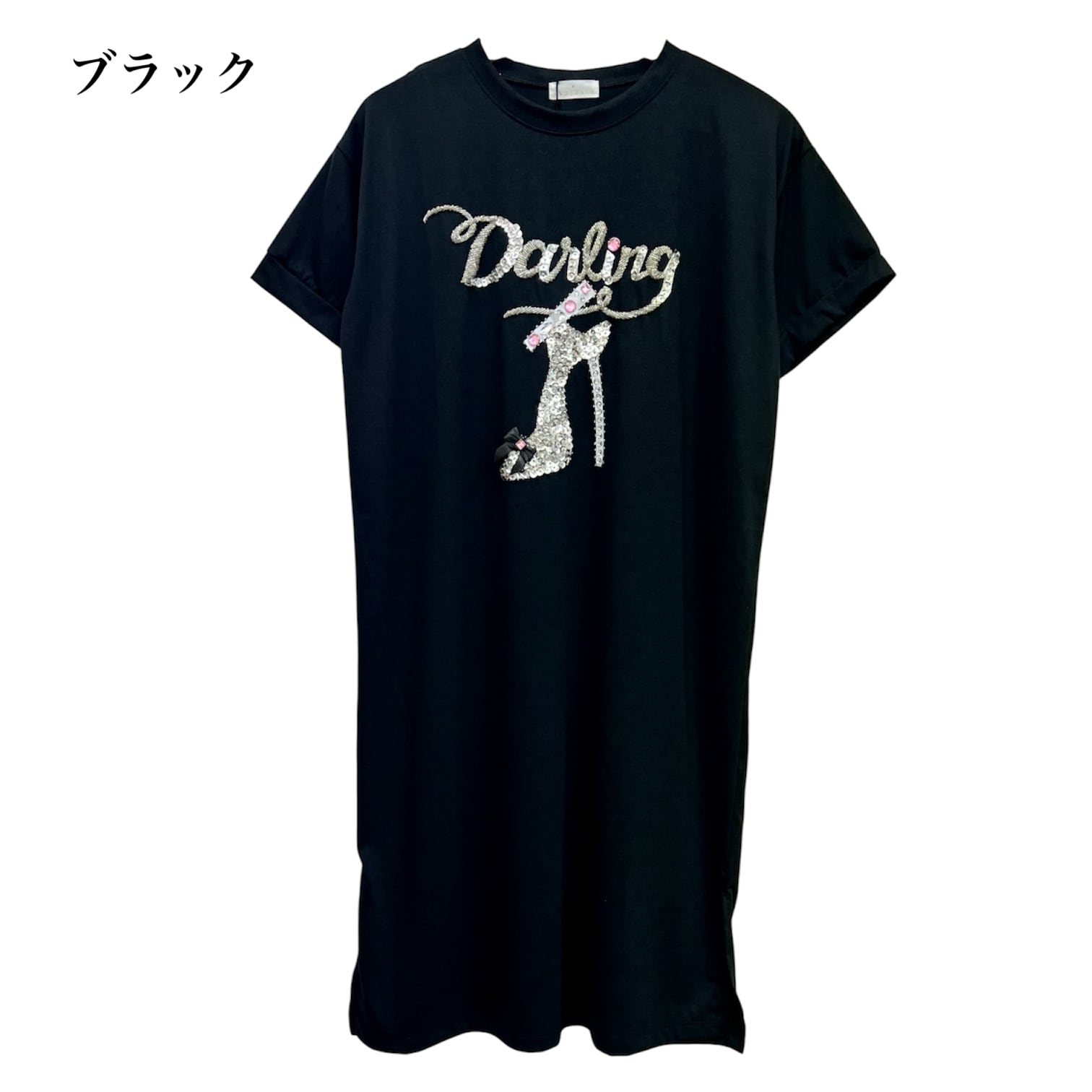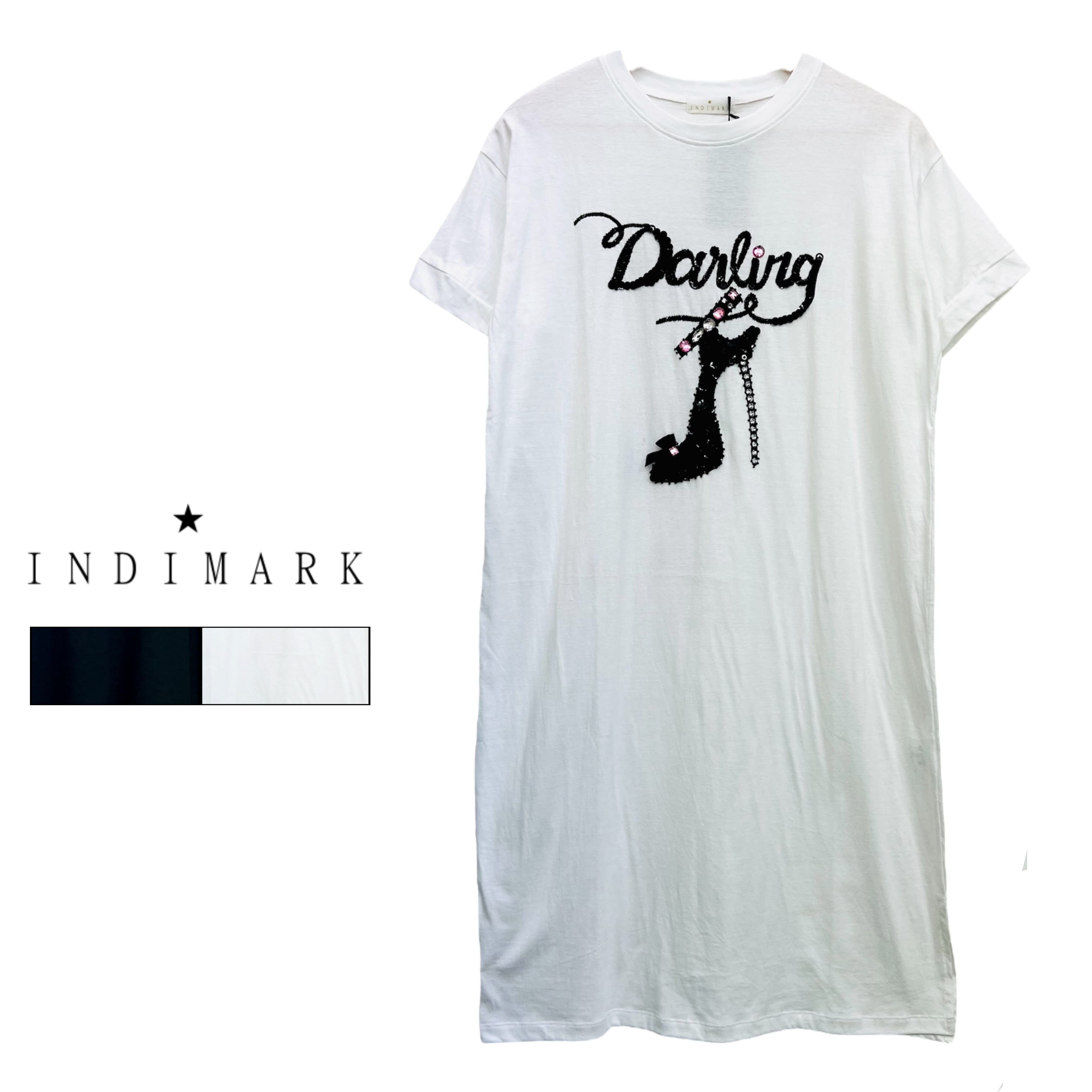 【INDIMARK】インディマーク A-168 ダーリン ビジュー チュニック Tシャツ レディース トップス スパンコール 半袖 ワンピース キラキラ きらきら ハイヒール モチーフ ロゴ ブランド 白 黒 シンプル