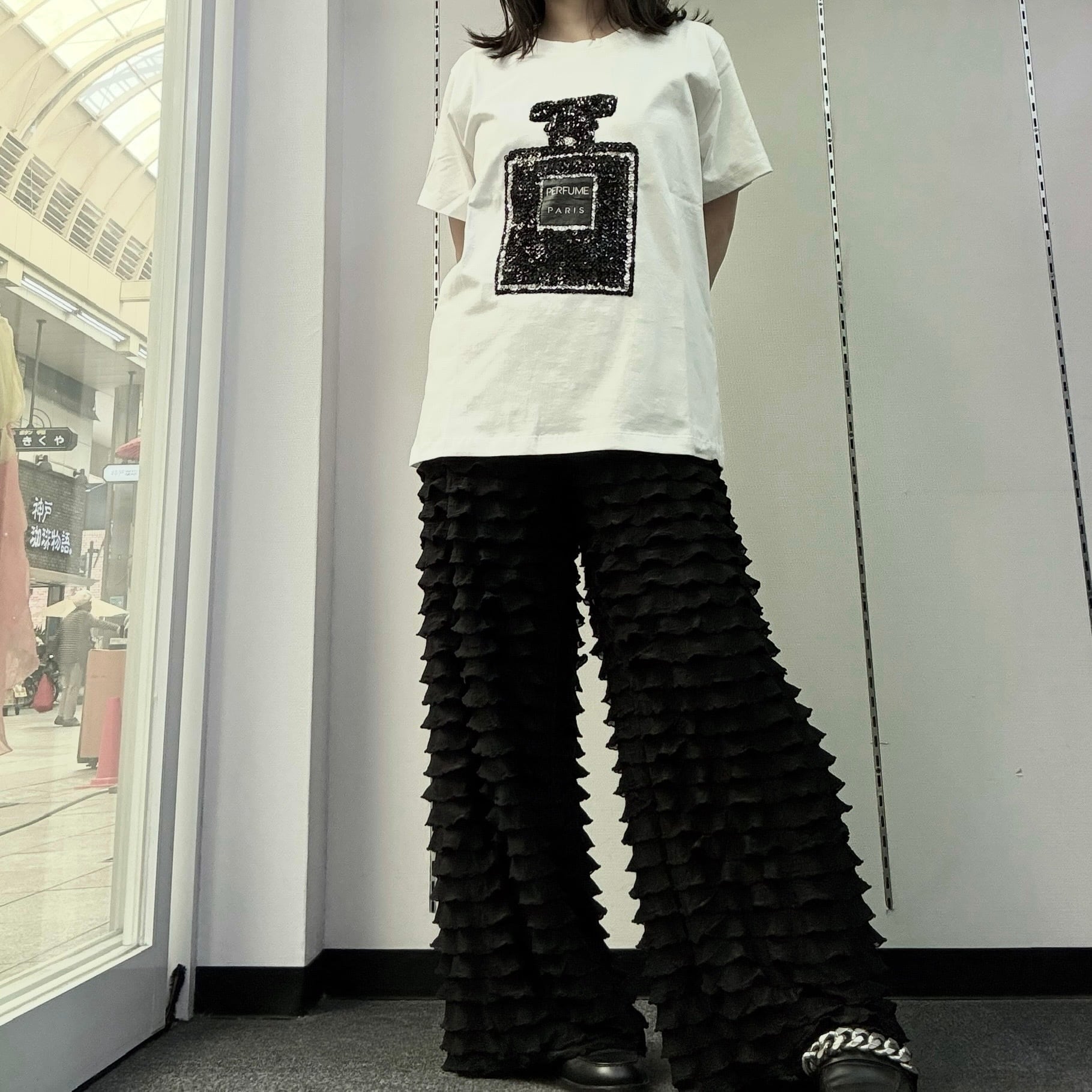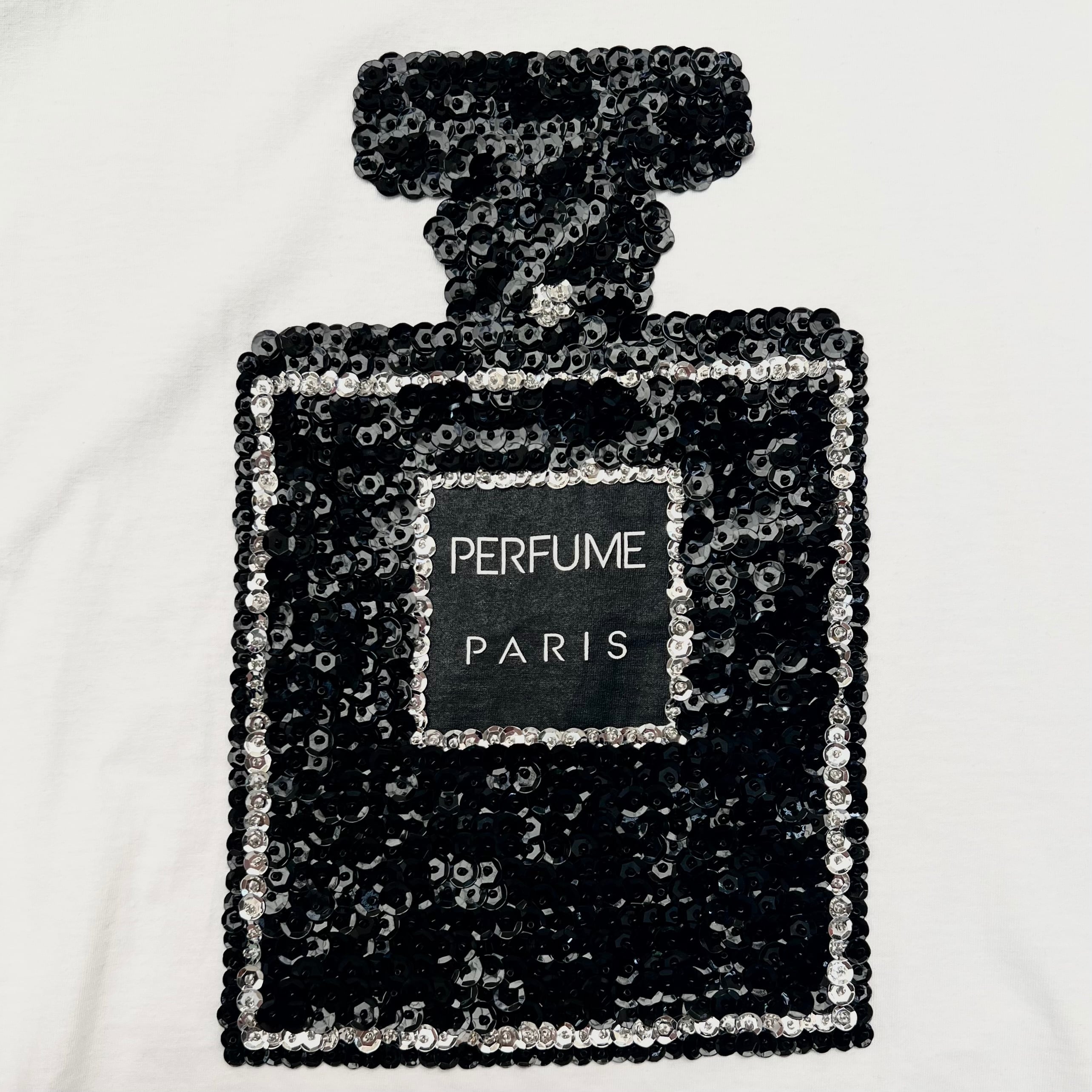【INDIMARK】インディマーク A-46 香水 ビジュー Tシャツ レディース トップス スパンコール 半袖 キラキラ きらきら モチーフ ロゴ ブランド 白 黒 シンプル