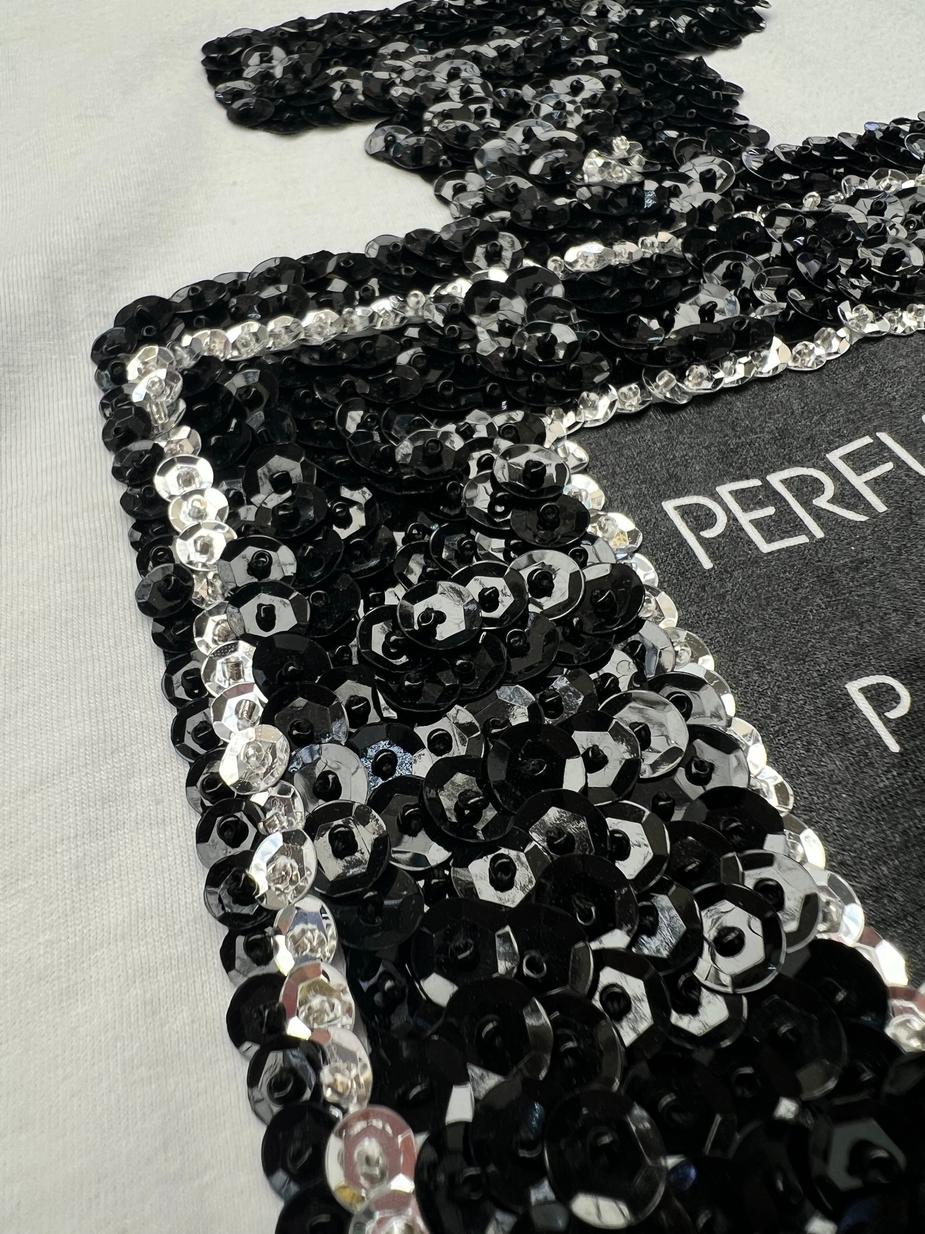 華やかなスパンコールで装飾されたデザインは、シンプルながらも特別感を演出します。半袖のスタイルは今の季節にぴったりで、普段使いから特別なシーンまで幅広く活躍します。