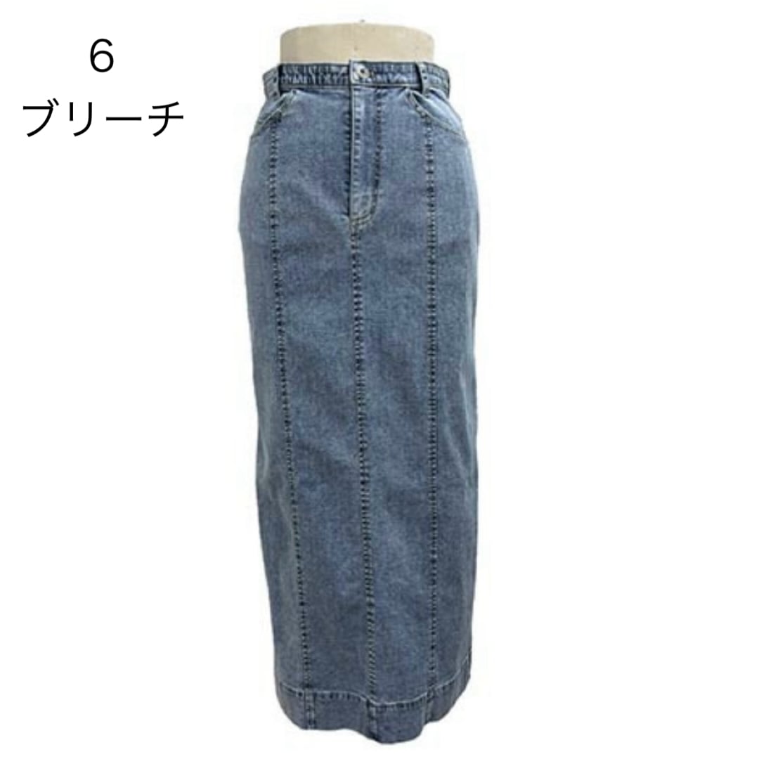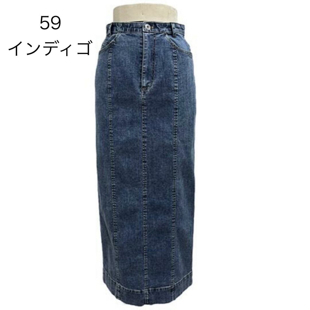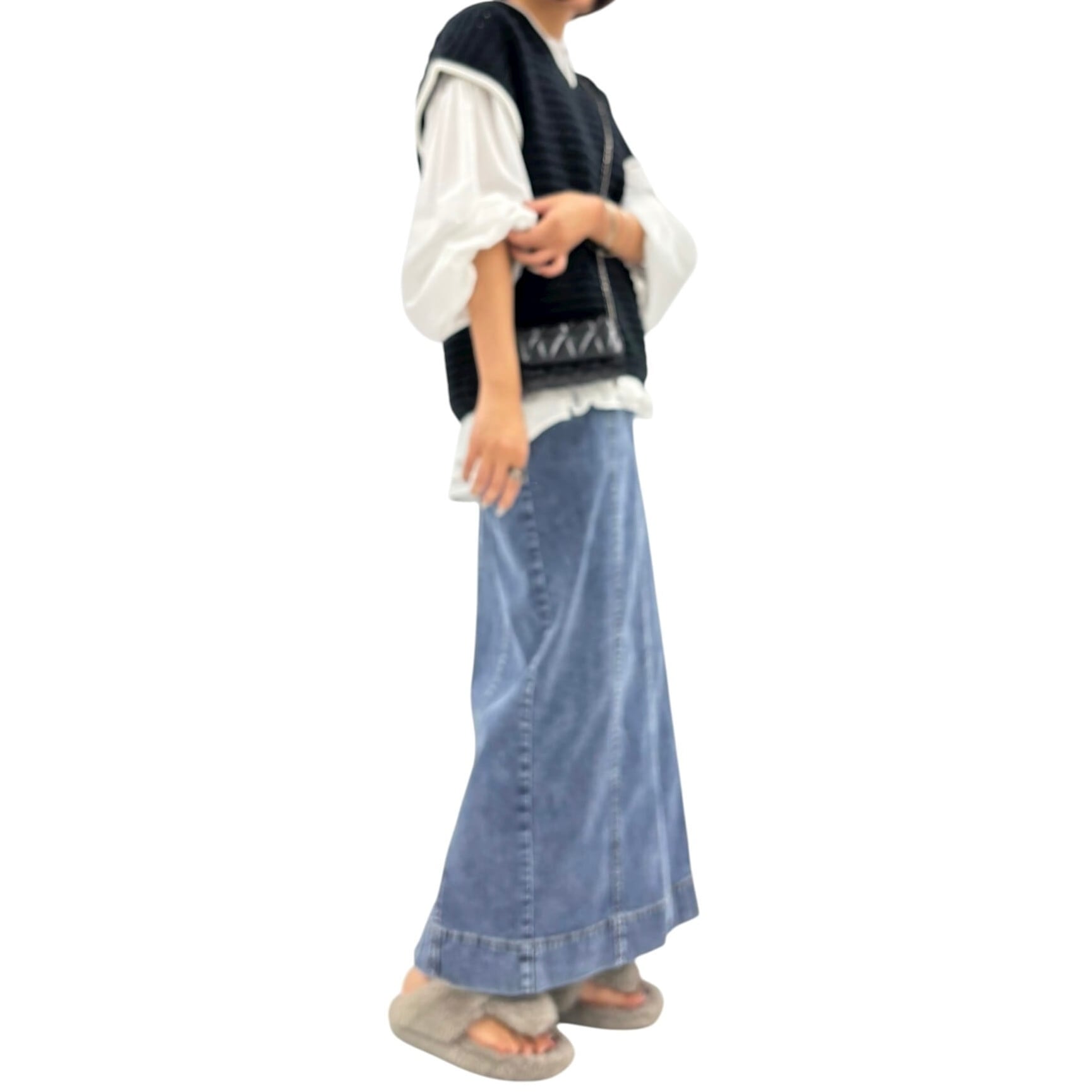 薄地で柔らかく、ストレッチ性のあるデニム地のペンシルスカートです。ウエストは内側にゴム入りで着脱も簡単です。